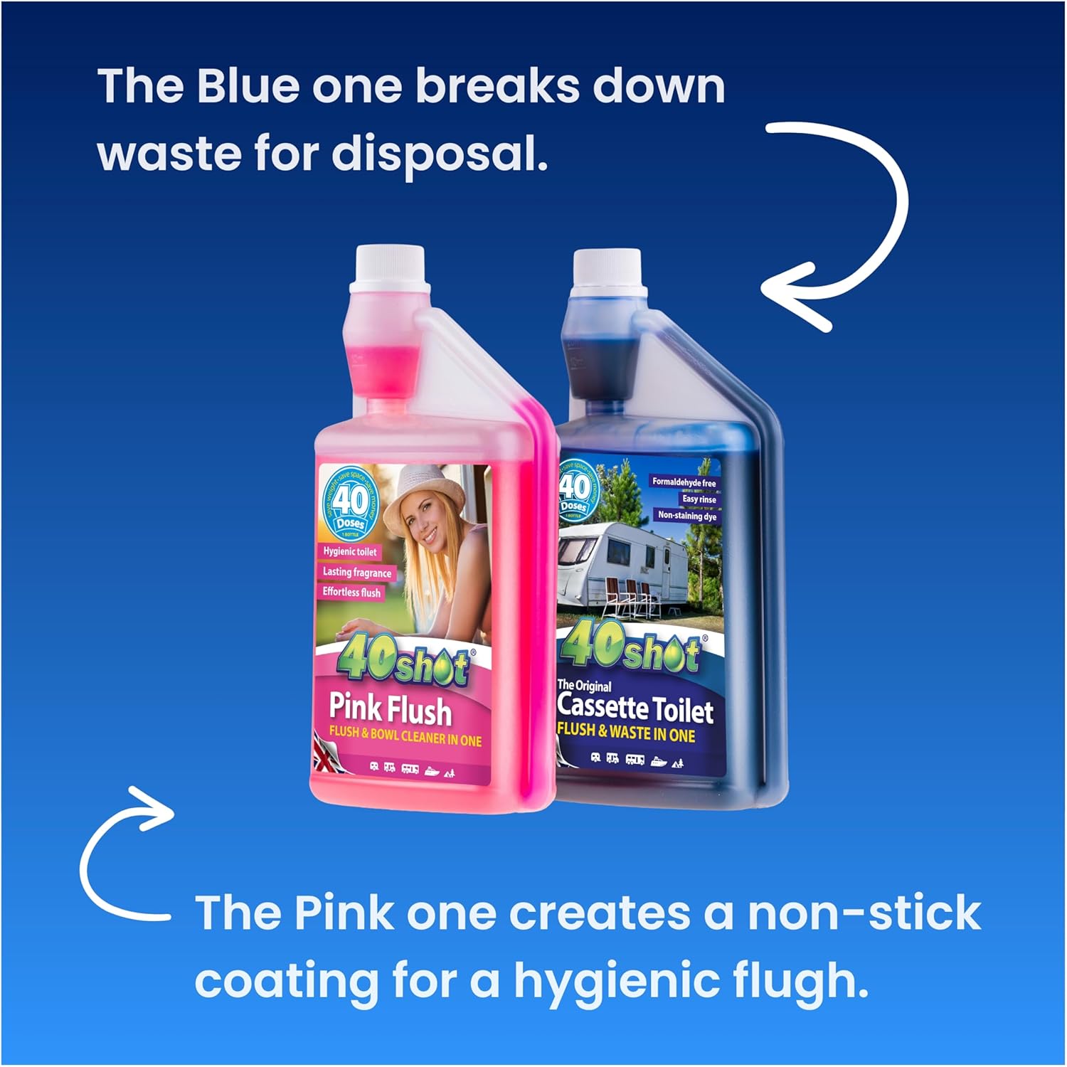 Portable Toilet Fluid 2 in 1 Weste & Rinse: Keep your cassette toilet fresh and clean with 40shot. The highly concentrated 1L Flush and Waste formula means you don’t need to take up valuable space or weight with separate bottles of Pink and Blue.