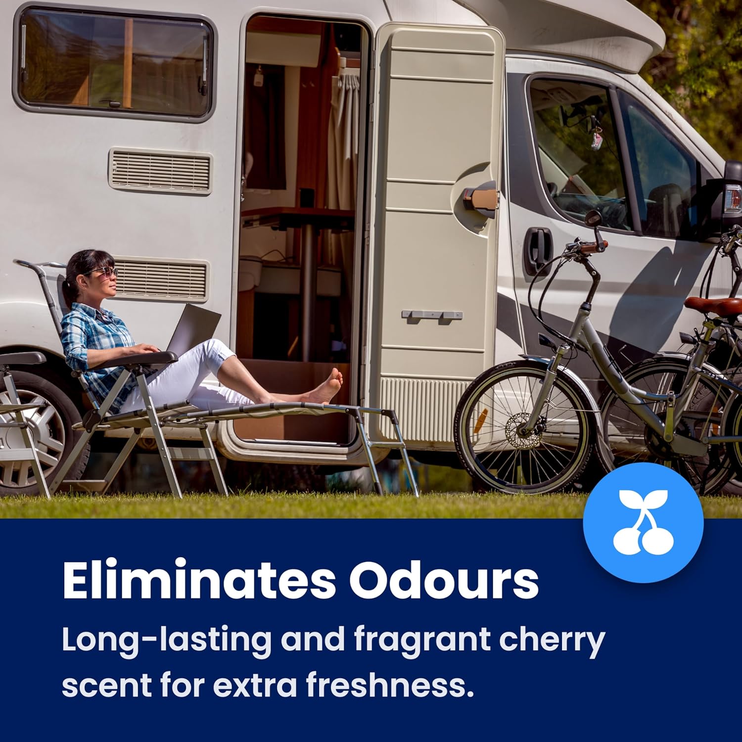 Long Lasting Performance: 40 shot caravan toilet chemical efficiently dissolves waste and totally eliminates unpleasant odours, leaving behind a completely clean system and a long-lasting amaretto cherry fragrance.