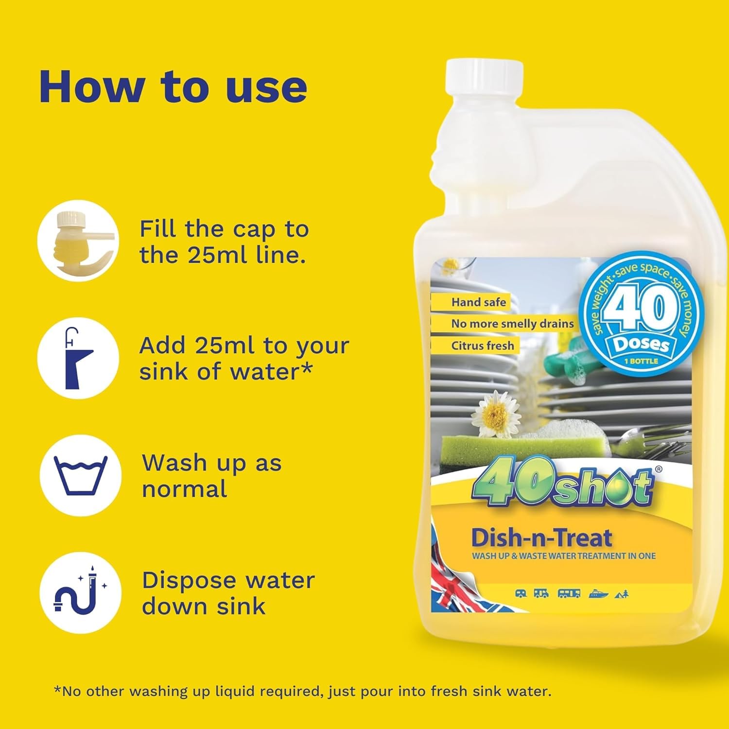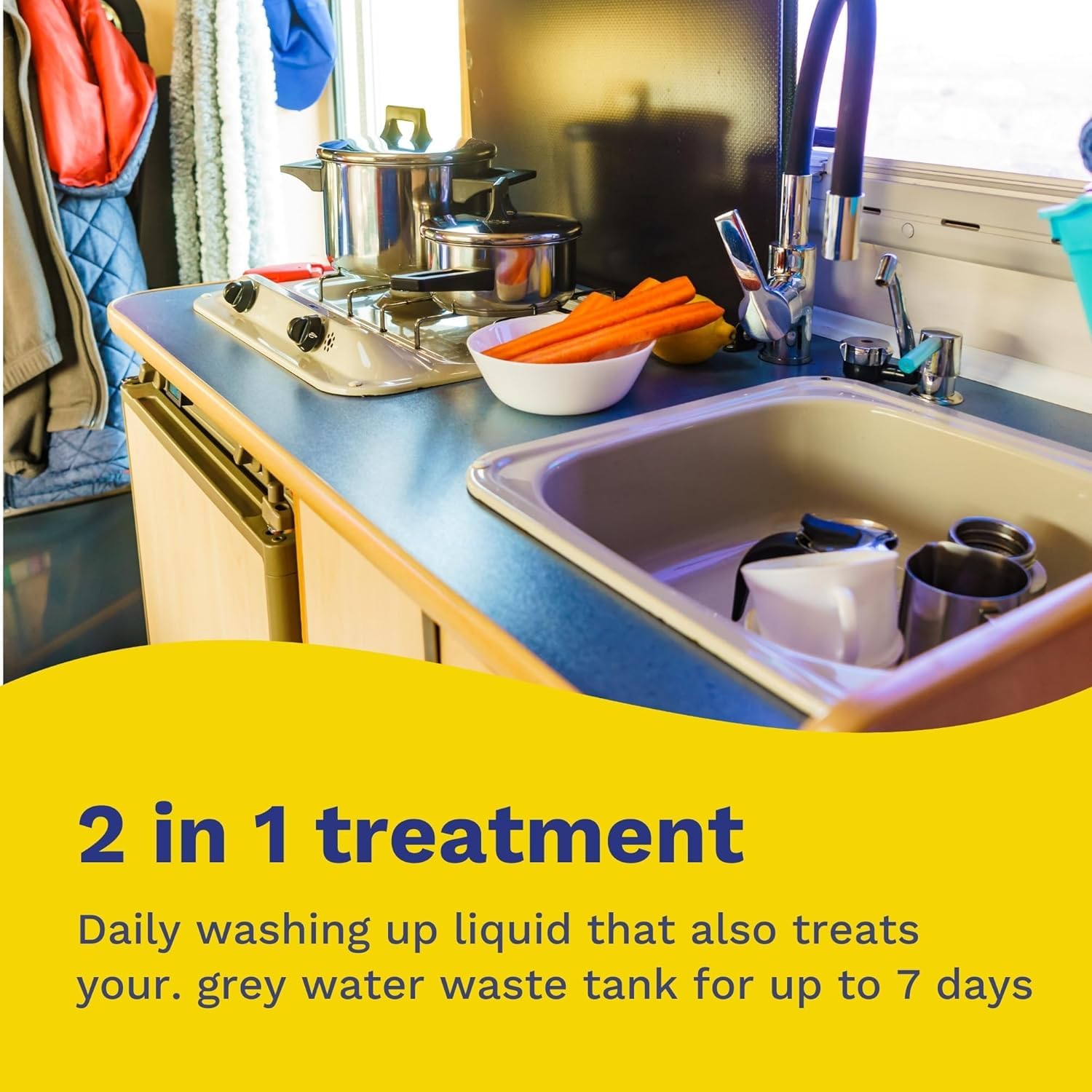 Dual-Action Washing Up Liquid & Grey Water Treatment. Specially formulated for caravans and motorhomes. Cleans dishes while actively treating your grey water tank to reduce smells, grease, and build-up with every wash.