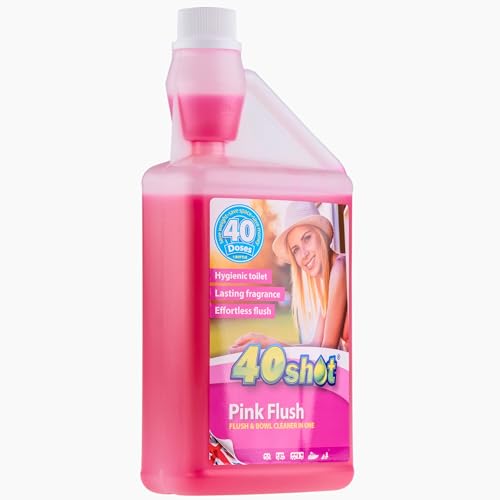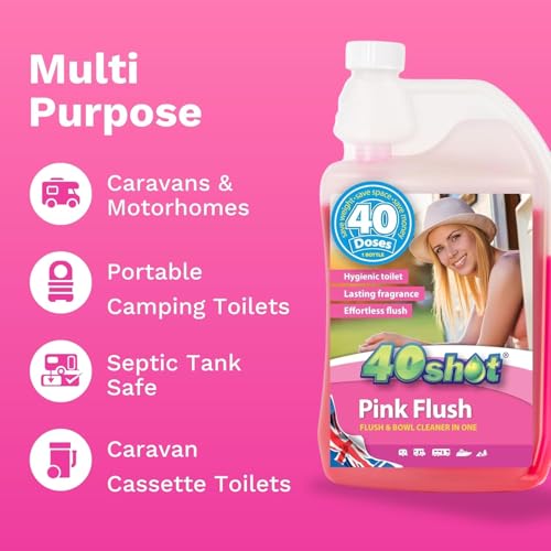 Maintain a clean and fresh-smelling toilet in your caravan or motorhome with the 40 Shot Pink Flush Toilet Rinse. This 1L concentrated solution is designed to provide up to 40 effective doses, ensuring long-lasting use and excellent value. The dual-action formula not only cleans the bowl but also enhances the flushing system, leaving a pleasant fragrance after each use. Its biodegradable and pH-neutral composition makes it safe for septic tanks and environmentally friendly. The built-in water softener combats limescale build-up, a common issue in hard water areas, thereby extending the life of your toilet system. The bottle’s integrated measuring reservoir allows for precise dosing, reducing waste and ensuring consistent results. Ideal for use in cassette toilets commonly found in caravans and motorhomes, the 40 Shot Pink Flush Toilet Rinse is a reliable and efficient solution for maintaining toilet hygiene on the go.