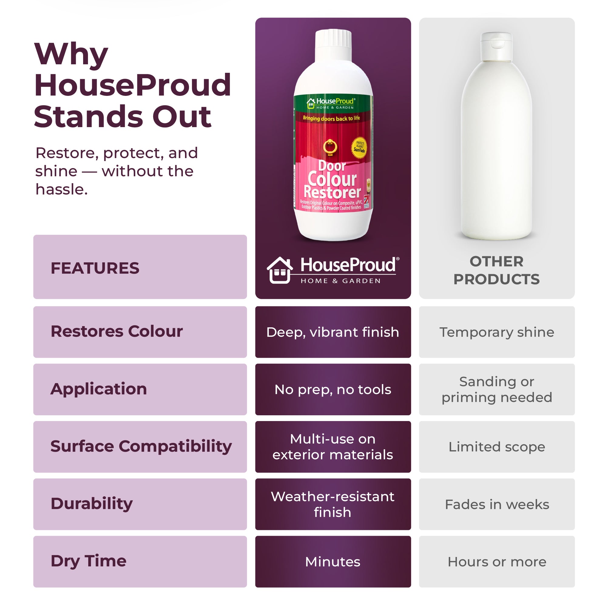 Why spend hundreds replacing doors when you can restore them for a fraction of that cost? A single 250 ml bottle goes a long way and offers excellent value. Keep your door looking its best — season after season.