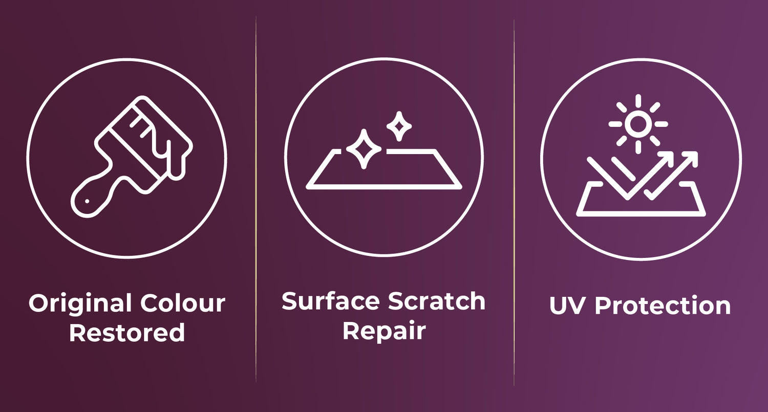 Repairs Sun Damage and Light Scratches. Fills in micro scratches and dull patches, restoring smoothness and rich colour. Shields against UV rays to prevent future fading.