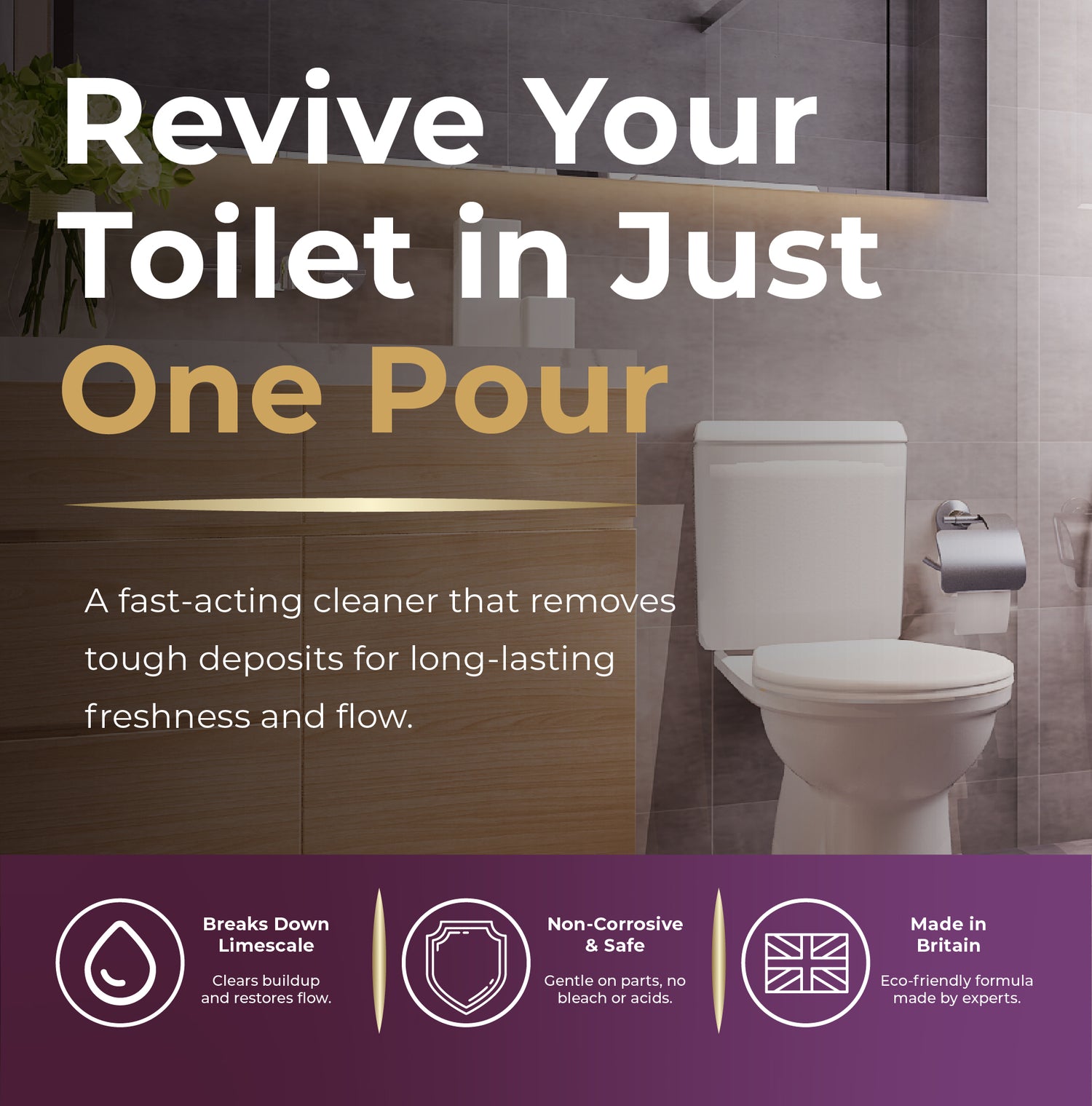 Fast-Acting, No Harsh Scrubbing Required. Just pour and leave — the advanced formula dissolves limescale and waste build-up quickly without manual scrubbing. Simple and effective.