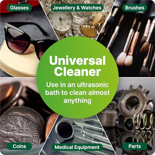 Versatile Multi-Purpose Solution: One concentrated cleaner for everything. Safely and effectively deep-clean your retainers, dentures, spectacles, watches, jewellery, makeup brushes, electric toothbrush heads, shaver heads, bicycle parts, vehicle components, and more in your ultrasonic bath.